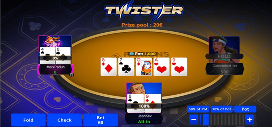 Même si le site est un tout nouveau venu, il dispose déjà des deux variantes les plus populaires, à savoir, le No Limit Hold’em et l’Omaha. Le cash game est disponible, tout comme les tournois qui proposent des buy-ins allant de 0.50 cts à 125 €. Les sit & go Twister sont également de la partie et donnent la possibilité de tenter un gros multiplicateur en très peu de temps.